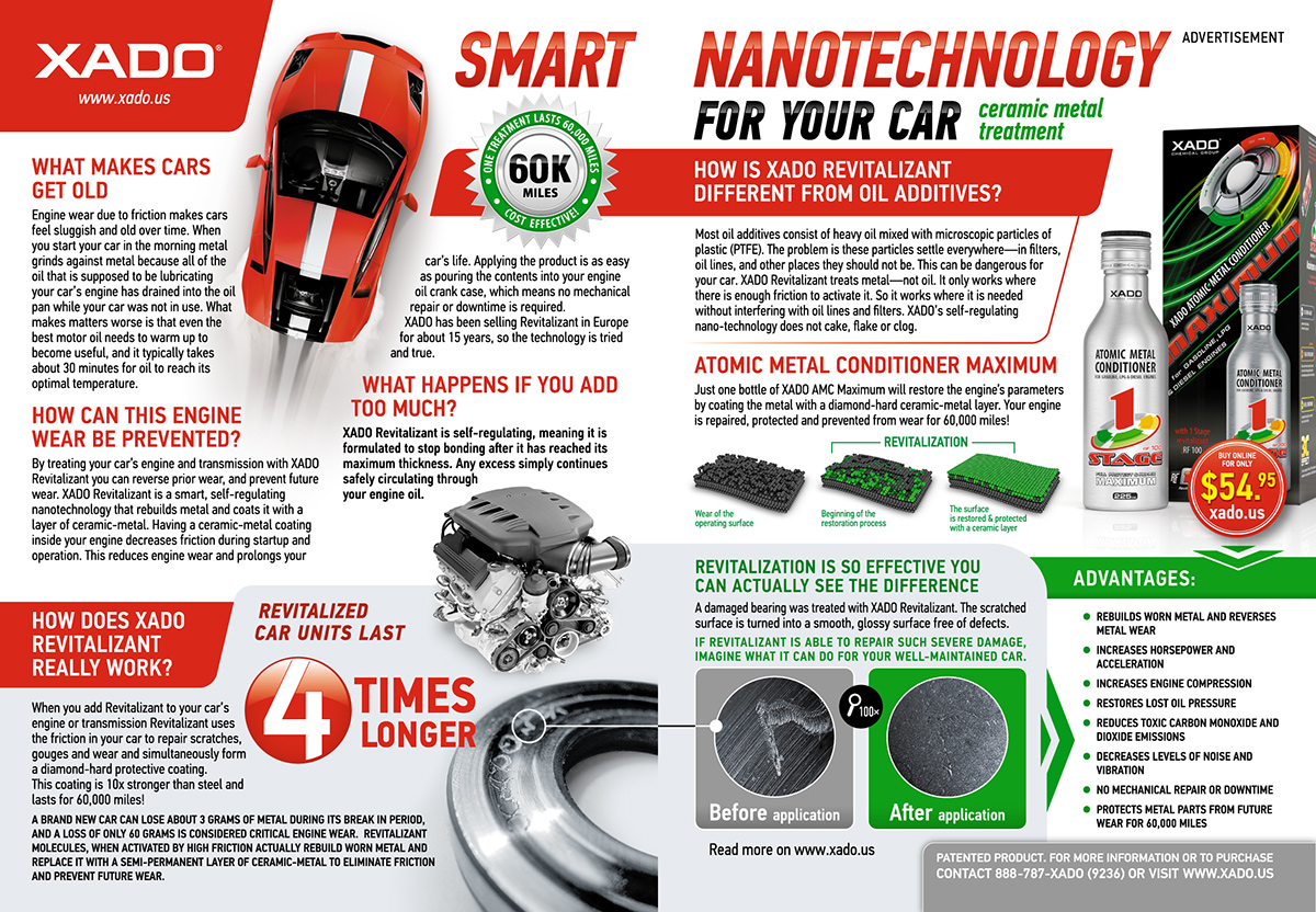 XADO technology is therefore a revolutionary form of nano technology and an alternative to all mechanical repairs, which restores, repairs and recondition engines, machinery and equipment across a wide range of industrial applications from the Automobile industry to the Railways, Weapons to Aircraft, Agricultural machinery to Household appliances, boats and Lawn mowers. The list is endless.