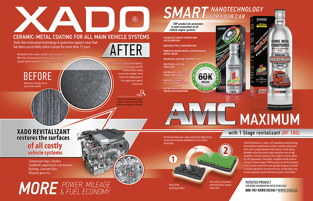XADO is an advanced world wide patented technology, which restores, repairs and reconditions worn mechanical moving parts, any engine, machinery and equipment, without the need for expensive dismantling. In engines this will reduce fuel consumption, increase compression and reduce exhaust emissions.